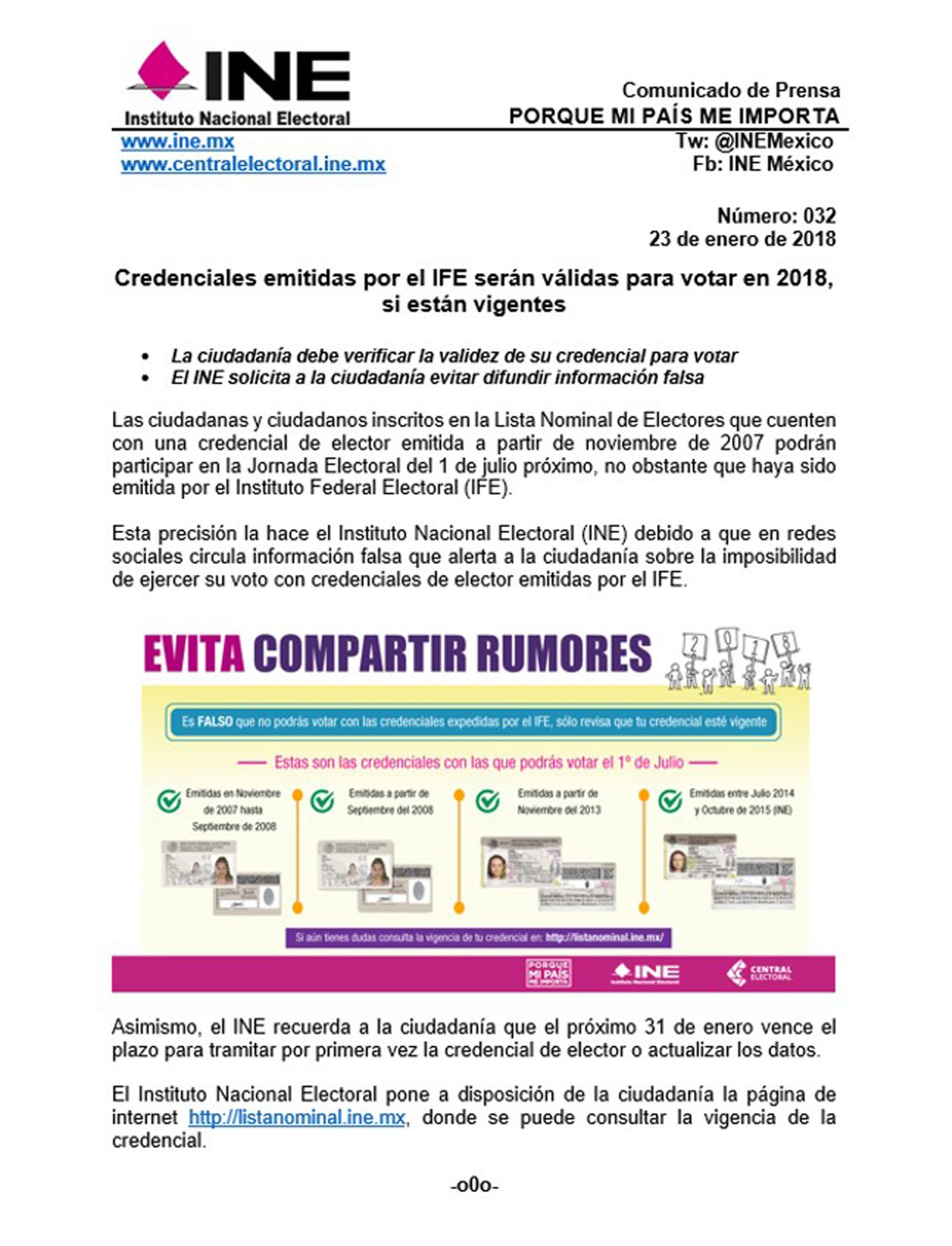 Esta precisión la hace el Instituto debido a que en redes sociales circula información falsa que alerta a la ciudadanía sobre la imposibilidad de ejercer su voto con credenciales de elector emitidas por el IFE.
