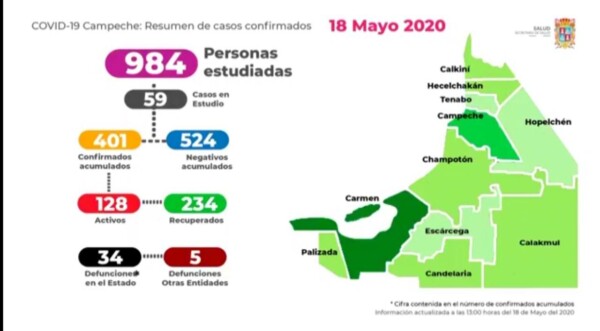 Publicado enMéxico Dos fallecimientos y 25 nuevos casos de Covid-19 en Campeche por Thiaré Pérez15 de mayo de 2020, 10:13 pm15 de mayo de 2020, 10:22 pm