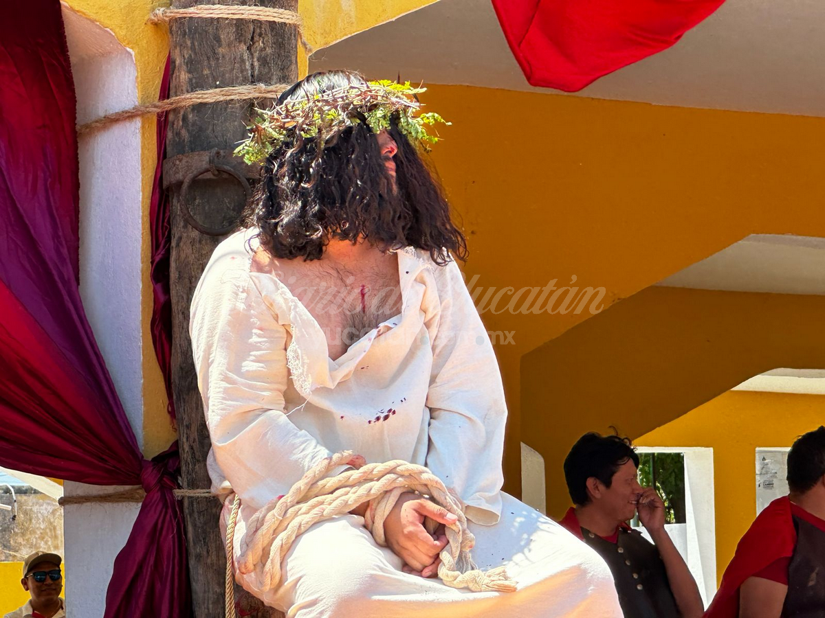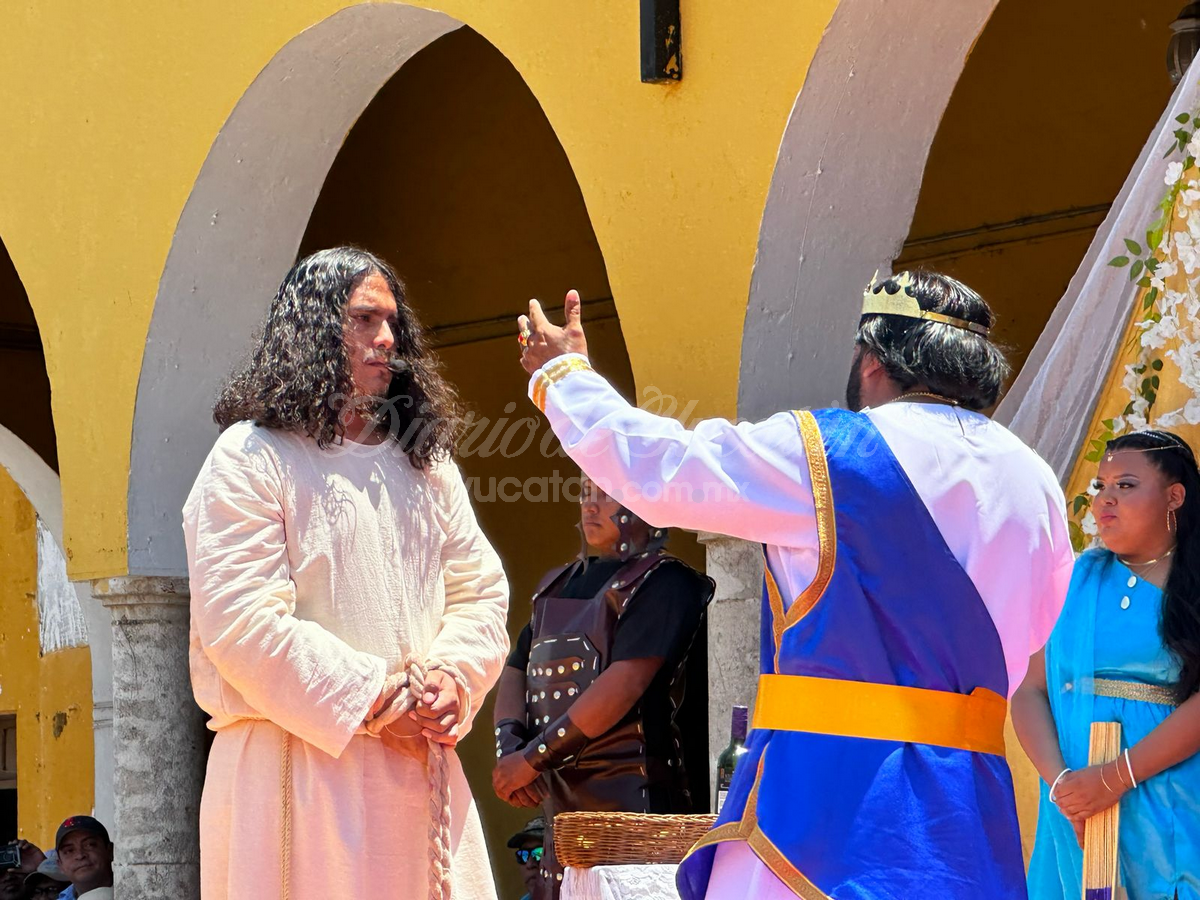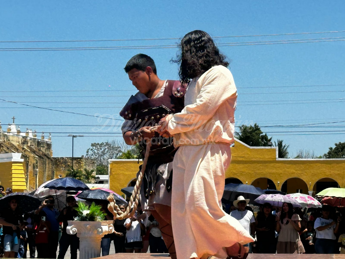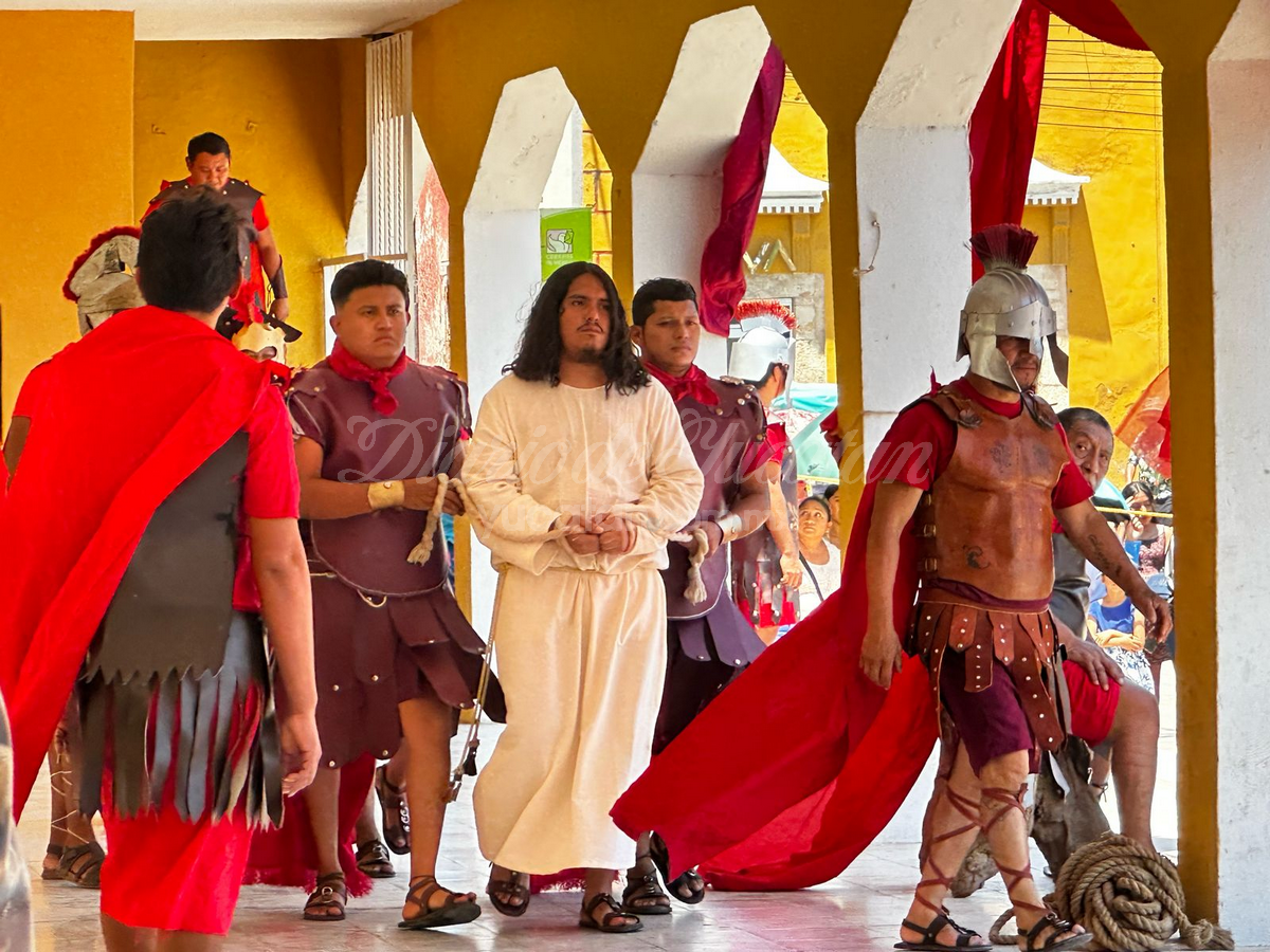Desde temprano, la plaza principal comenzó a llenarse. Personas de todas las edades, familias completas, visitantes locales, turistas nacionales y extranjeros buscaron lugar para no perderse detalle del viacrucis viviente más tradicional de esta parte del estado. La escena inicial arrancó en la Capilla de Nuestra Señora de Guadalupe, donde Jesús —encarnado este año por el joven Juan Carlos Rivero Mucul— fue apresado por soldados romanos en medio de empujones, gritos y jaloneos. La multitud no tardó en meterse de lleno en la escena.