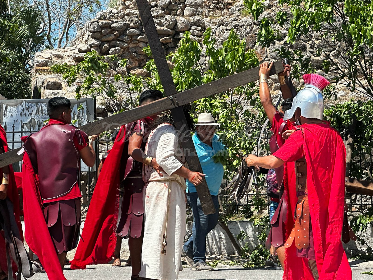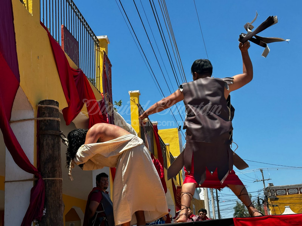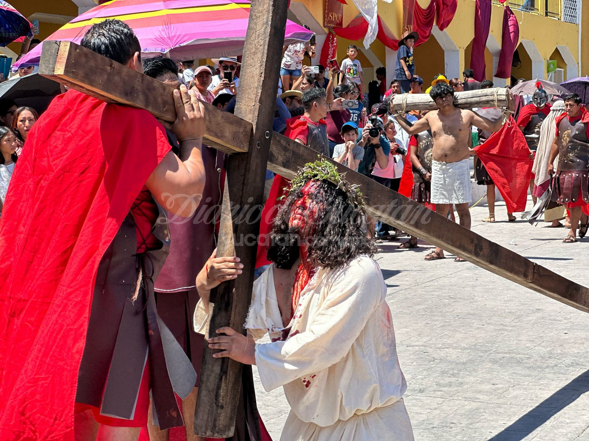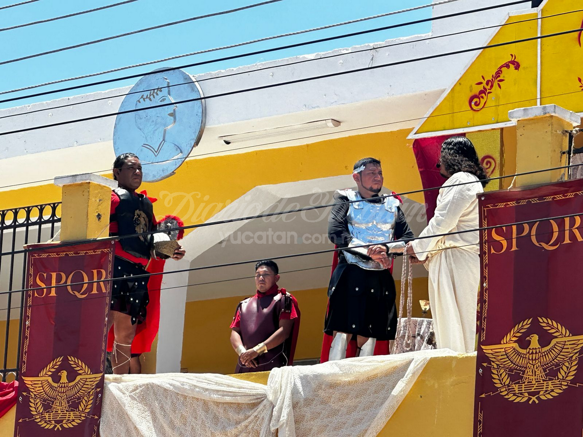Desde temprano, la plaza principal comenzó a llenarse. Personas de todas las edades, familias completas, visitantes locales, turistas nacionales y extranjeros buscaron lugar para no perderse detalle del viacrucis viviente más tradicional de esta parte del estado. La escena inicial arrancó en la Capilla de Nuestra Señora de Guadalupe, donde Jesús —encarnado este año por el joven Juan Carlos Rivero Mucul— fue apresado por soldados romanos en medio de empujones, gritos y jaloneos. La multitud no tardó en meterse de lleno en la escena.